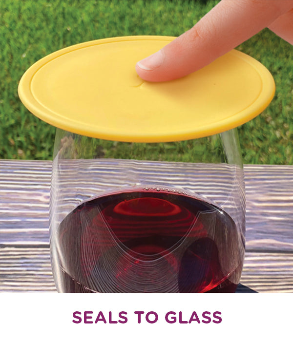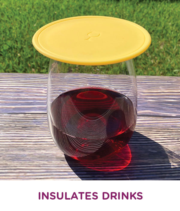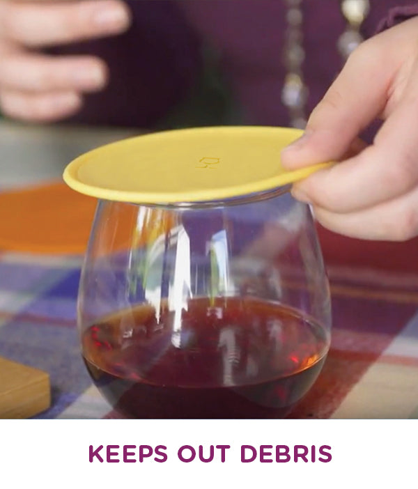 Enjoy the outdoors AND your beverage! Drink Tops™ TAP & SEAL™ outdoor glass covers are a fun and easy way to keep outdoor elements out of drinks. High-quality, BPA-free silicone covers help drinks stay cool longer, and seals to glasses with a simple tap to the center. Just Cover, Sip, and Enjoy!